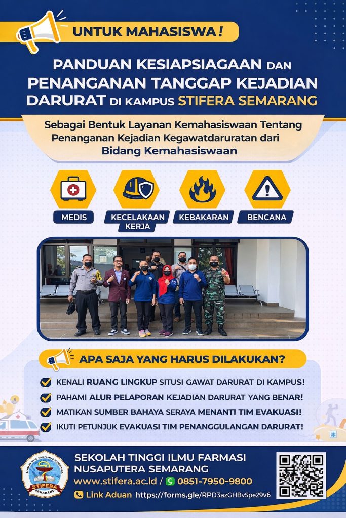 Sebagai bentuk komitmen terhadap keselamatan dan perlindungan mahasiswa, Bidang Kemahasiswaan STIFERA Semarang menyelenggarakan layanan Kesiapsiagaan dan Penanganan Tanggap Kejadian Darurat di Lingkungan Kampus.