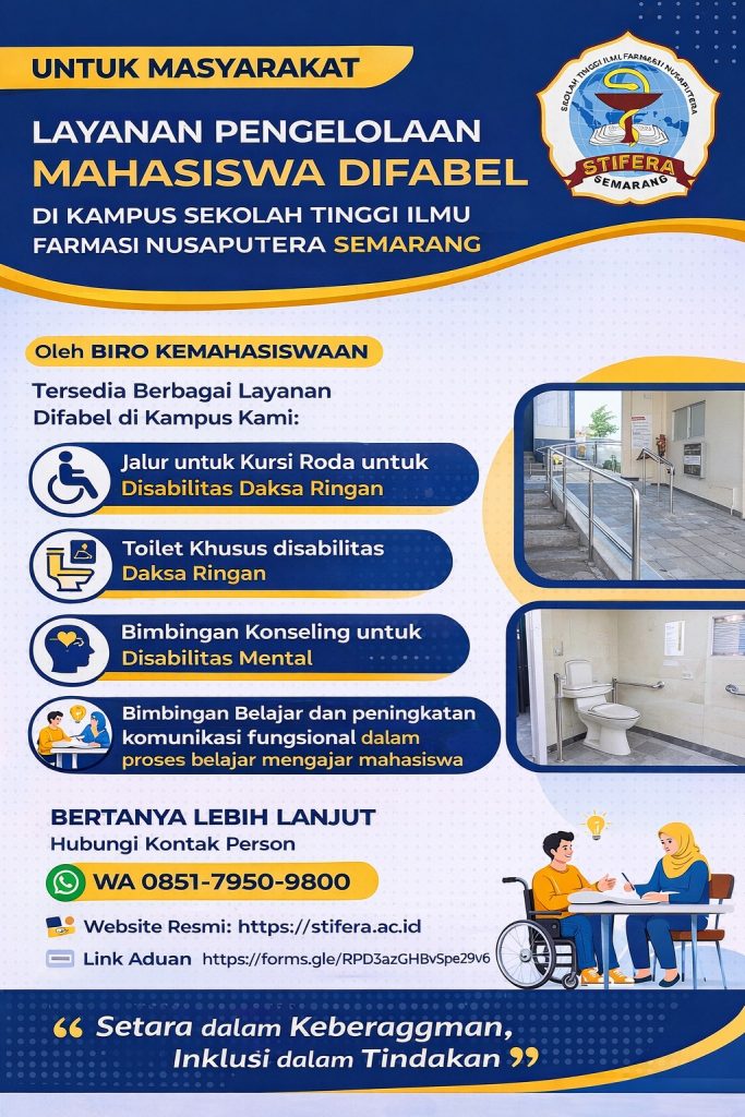 Sekolah Tinggi Ilmu Farmasi Nusaputera (STIFERA Semarang) berkomitmen mewujudkan kampus yang inklusif dan ramah bagi seluruh mahasiswa, termasuk mahasiswa difabel. Melalui Biro Kemahasiswaan, STIFERA menghadirkan layanan pengelolaan dan pendampingan khusus sebagai bentuk dukungan terhadap kesetaraan akses pendidikan tinggi.