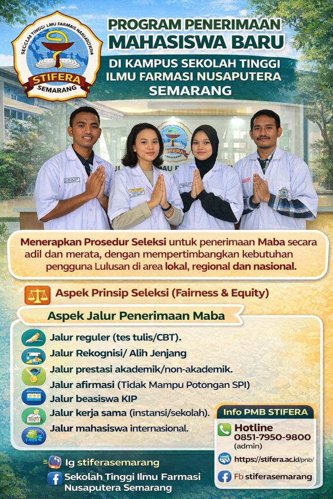 Sekolah Tinggi Ilmu Farmasi Nusaputera Semarang membuka kesempatan bagi generasi muda untuk bergabung dan berkembang di bidang kefarmasian dengan sistem seleksi yang adil, transparan, dan akuntabel sesuai kebijakan nasional.