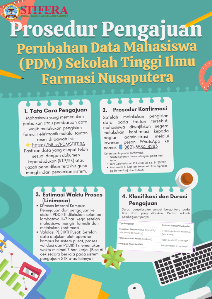 Keakuratan data pada Pangkalan Data Pendidikan Tinggi (PDDIKTI) merupakan hal yang sangat krusial bagi setiap mahasiswa dan alumni, karena berkaitan langsung dengan legalitas ijazah dan pelaporan aktivitas akademik secara nasional. Guna memfasilitasi kebutuhan tersebut, Sekolah Tinggi Ilmu Farmasi Nusaputera (STIFERA) menyediakan layanan Perubahan Data Mahasiswa (PDM) dengan prosedur sebagai berikut: